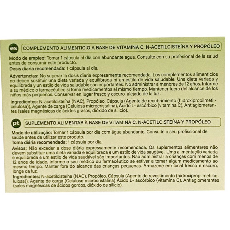 Acetil Plus ACETILCISTEINA 300 mg es un complemento alimenticio en formato cápsulas diseñado con una fórmula avanzada que combina N-Acetilcisteína (NAC), Propóleo y Vitamina C. Esta sinergia de ingredientes ha sido cuidadosamente seleccionada para apoyar las defensas naturales del organismo, favorecer el bienestar respiratorio y proteger las células frente al daño oxidativo. Cada cápsula contiene 300 mg de N-Acetilcisteína, 200 mg de Propóleo y 80 mg de Vitamina C (aportando el 100% del Valor de Referencia de Nutrientes).
