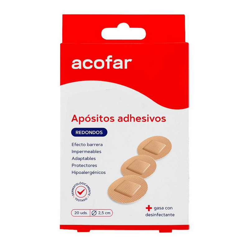 Acofar Apósitos Adhesivos Redondos son apósitos hipoalergénicos e impermeables diseñados para proteger eficazmente pequeñas heridas o rozaduras manteniendo un entorno higiénico y seguro. Gracias a su forma redonda de 2,5 cm, se adaptan perfectamente a zonas de difícil cobertura, garantizando una adherencia óptima y un confort total durante su uso.