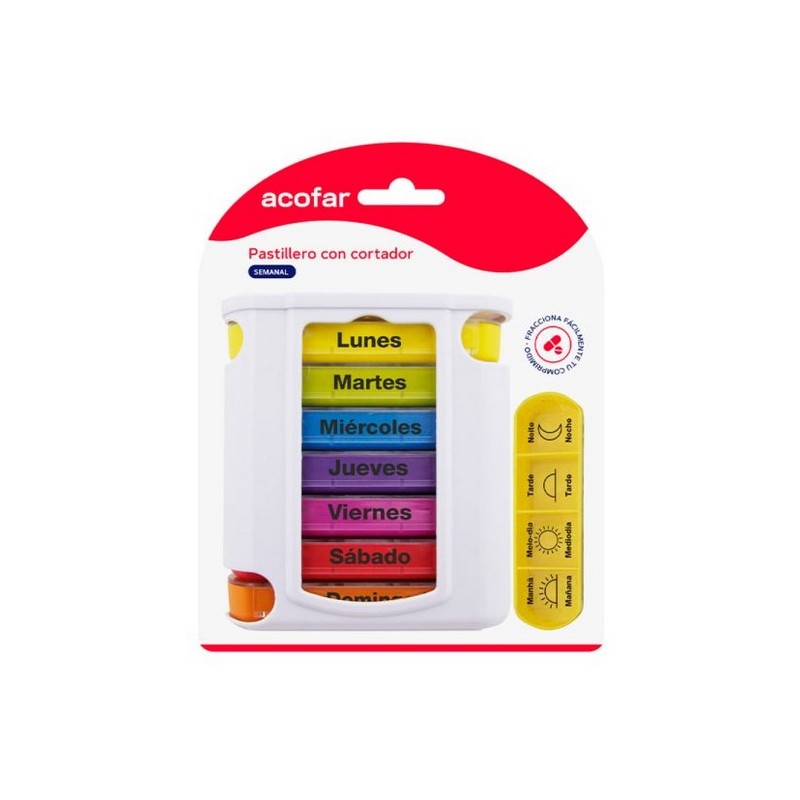 Acofar Pastillero Semanal con Cortador organiza la medicación en 7 módulos diarios con compartimentos y un cortador de comprimidos integrado. Ideal para llevar un control cómodo, seguro y claro del tratamiento gracias a su diseño compacto y sus módulos extraíbles por colores.