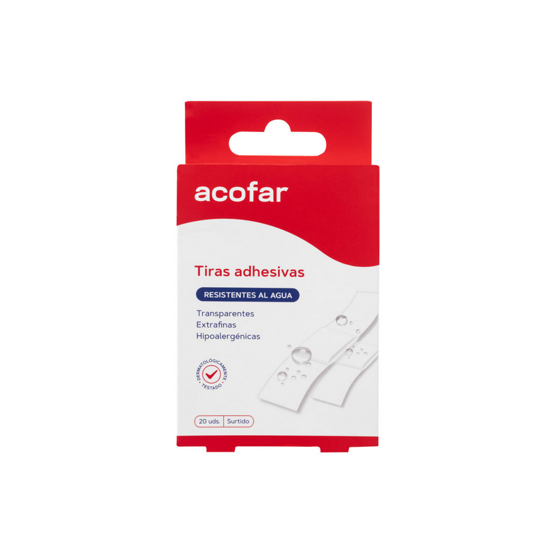 Acofar Tiras Adhesivas Resistentes al Agua son apósitos diseñados especialmente para ofrecer una protección impermeable y duradera frente al agua, la suciedad y otros agentes externos. Gracias a su composición de poliuretano transparente ultrafino, permiten mantener la herida protegida mientras favorecen la transpiración natural de la piel. Su diseño extrafino e hipoalergénico garantiza una excelente adaptabilidad a cualquier parte del cuerpo, proporcionando confort y seguridad en todo momento.