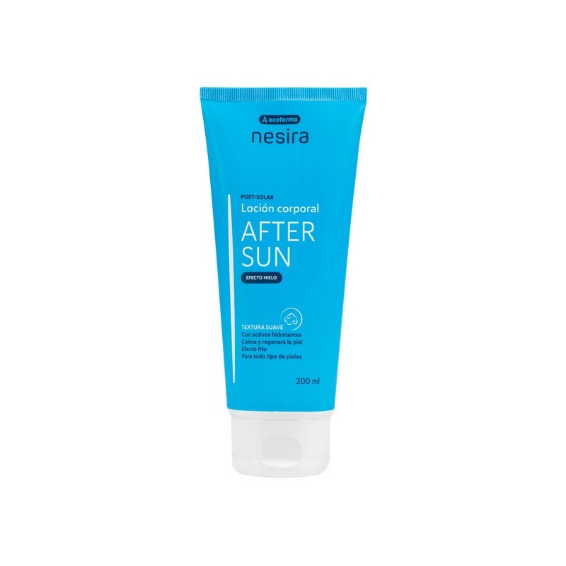 Acofarma Nesira After-Sun Efecto Hielo es una loción con efecto hielo que alivia al instante la piel caliente y enrojecida tras el sol. Con aloe vera, vitamina E, avena y camomila, hidrata, calma y prolonga el bronceado evitando la descamación. Ideal para mantener tu piel fresca, suave y protegida después del sol.