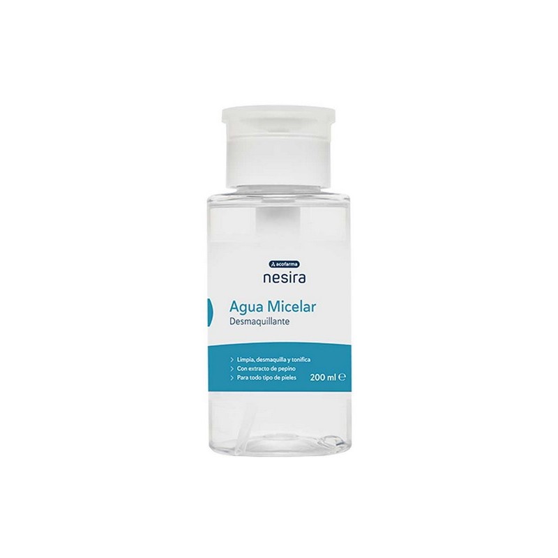 Acofarma Nesira Agua Micelar limpia suavemente el rostro, ojos y labios eliminando maquillaje e impurezas. Enriquecida con extracto de pepino, hidrata, tonifica y refresca la piel, dejándola suave, tersa y luminosa. Ideal para todo tipo de pieles y sin necesidad de aclarado.