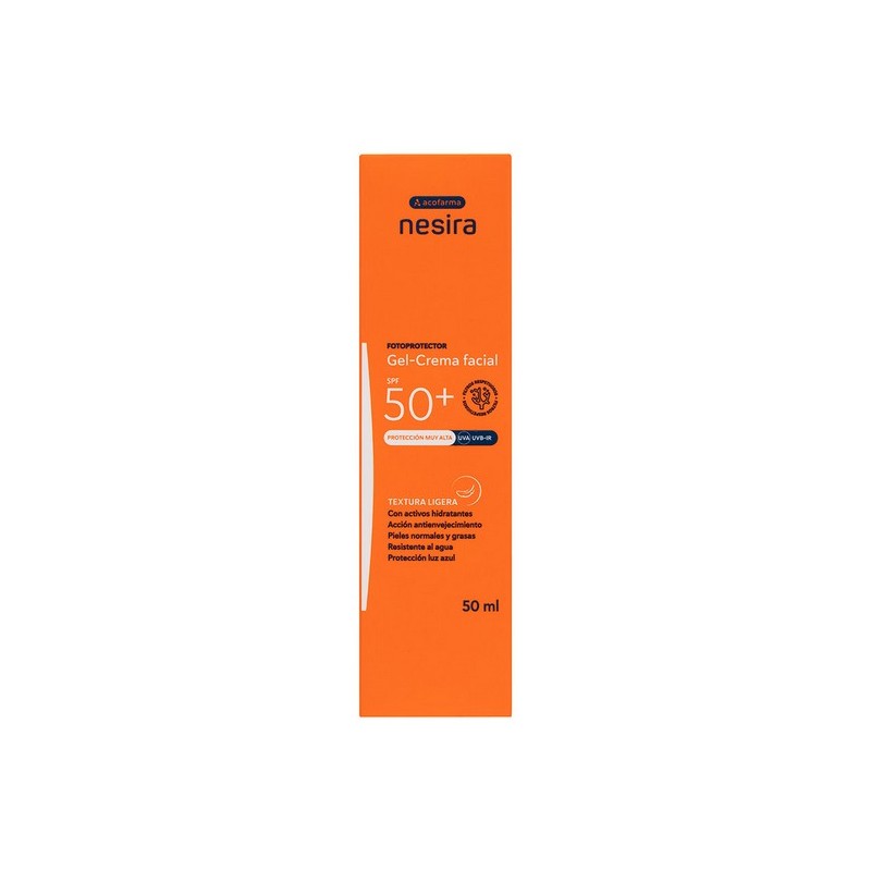 Acofarma Nesira Gel-Crema Solar SPF50+ es un fotoprotector facial con textura refrescante que hidrata y protege frente a UVA, UVB e IR. Su fórmula con hidrantes y antioxidantes previene el envejecimiento prematuro y mantiene la piel suave y confortable. Ideal para todo tipo de pieles, incluso mixtas y grasas. ¡La protección diaria que tu rostro necesita!