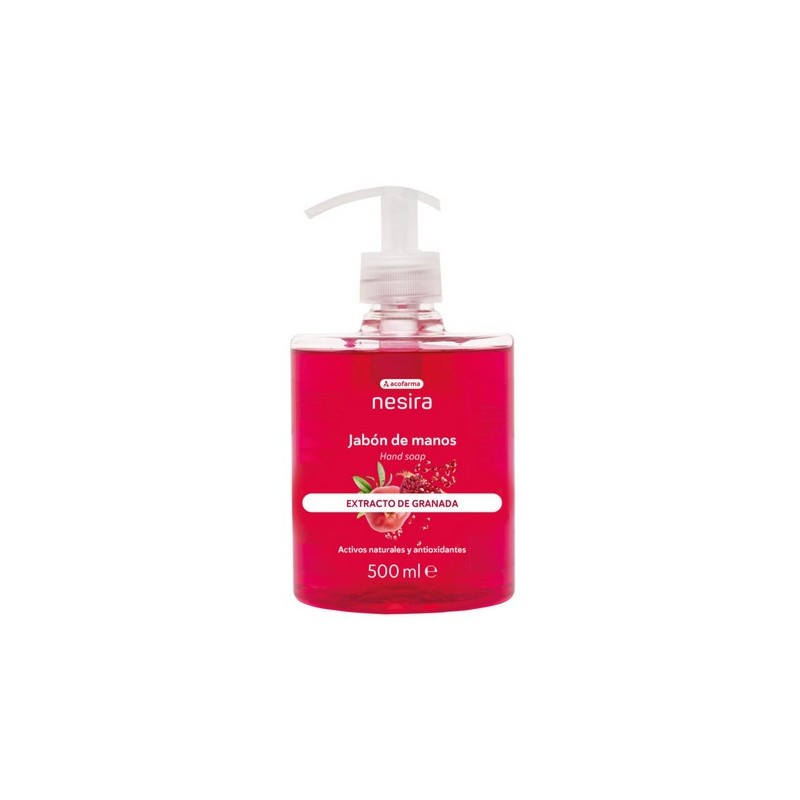 Acofarma Nesira Jabón de Manos Extracto de Granada limpia y protege las manos gracias a su extracto de granada antioxidante. Ideal para todo tipo de pieles, incluso las más sensibles. Respeta el pH natural y deja las manos suaves, flexibles y delicadamente perfumadas. Perfecto para el uso diario de toda la familia.