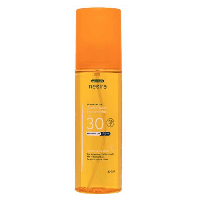 Acofarma Nesira Aceite Seco Bronceador SPF30 es un aceite bronceador diseñado para ofrecer un bronceado radiante mientras cuida tu piel con la protección solar que necesita.