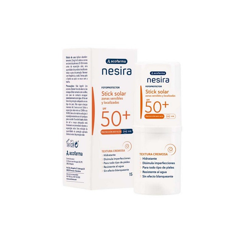 Acofarma Nesira Stick Solar Zonas Sensibles SPF50+ es un protector solar de muy alta protección diseñado específicamente para cuidar y defender aquellas áreas del rostro y del cuerpo que requieren un extra de atención y seguridad frente al sol. Su práctico formato en stick permite una aplicación local precisa, rápida y cómoda, ideal para cicatrices, manchas, tatuajes y zonas sensibles como nariz, labios, orejas o contorno de los ojos.