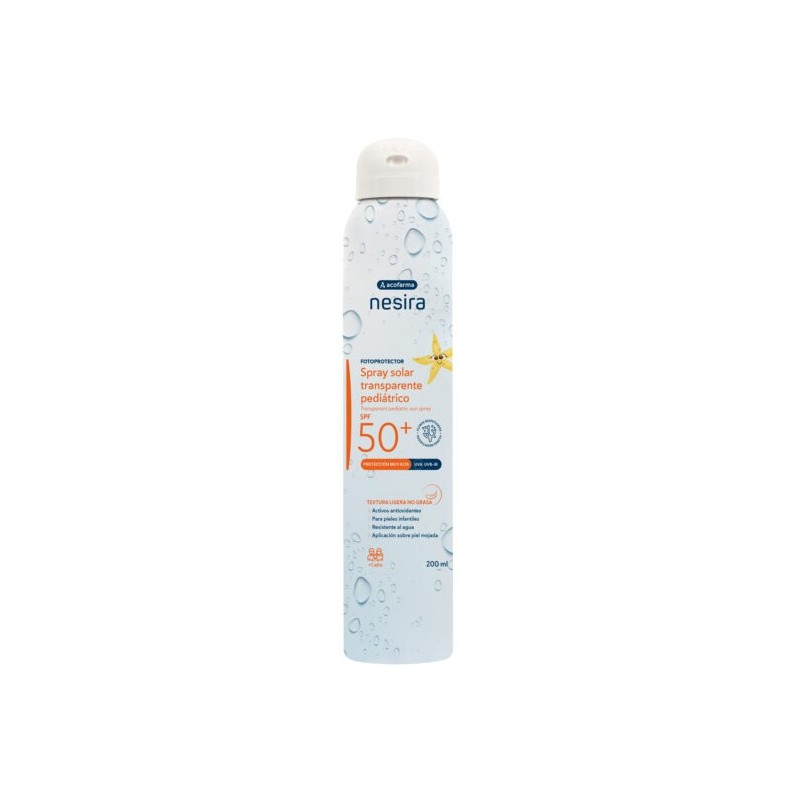 Acofarma Nesira Spray Solar Transparente Pediátrico SPF 50+ es un protector solar de textura ligera, no grasa, especialmente formulado para proteger la piel infantil de la exposición solar.