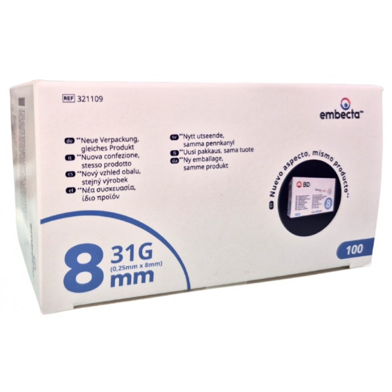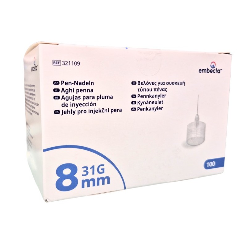 La Aguja Estéril Embecta para Plumas 8 mm es un dispositivo médico diseñado específicamente para facilitar la administración de insulina y otros medicamentos mediante plumas de inyección.