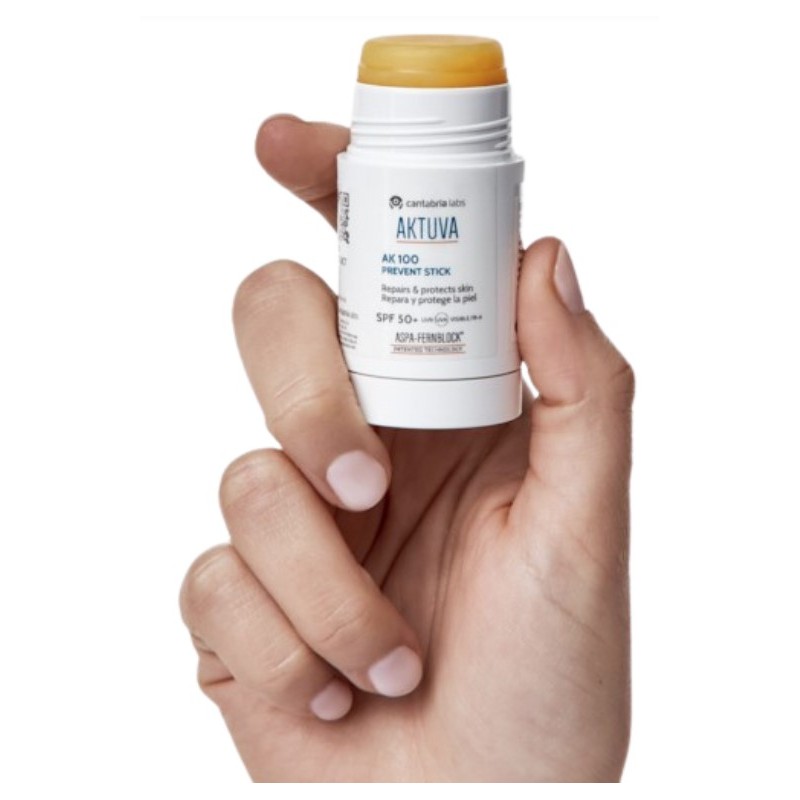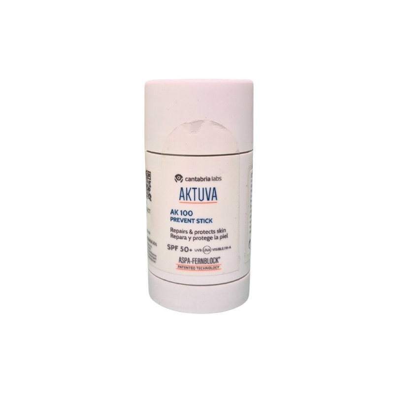 Aktuva AK 100 Prevent Stick SPF 50+ es un stick fotoprotector SPF 50+ para rostro y labios que protege y repara la piel sometida a exposición solar continuada y polución. Apto para todo tipo de pieles, incluso sensibles, con acabado de tacto seco, resistente al agua y al sudor.