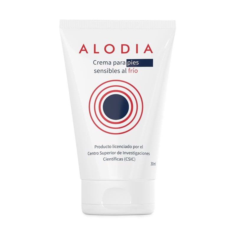 Alodia Pies es una crema especialmente diseñada para tratar la sensibilidad extrema al frío en los pies. Es ideal para personas que sufren de alodinia, una condición que provoca dolor ante estímulos que normalmente no deberían ser molestos, como caminar descalzo en superficies frías o llevar calzado durante el invierno. Su fórmula avanzada contiene el innovador compuesto DHC-A27, desarrollado por el CSIC, que actúa bloqueando los receptores sensoriales TRPM8, responsables de la percepción anormal de frío y tacto.