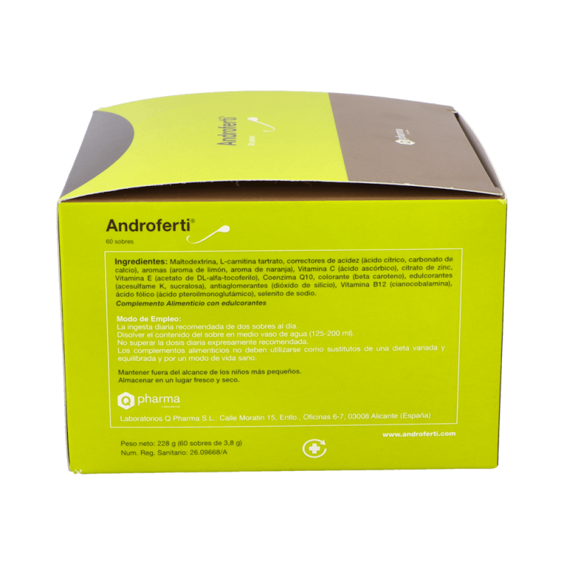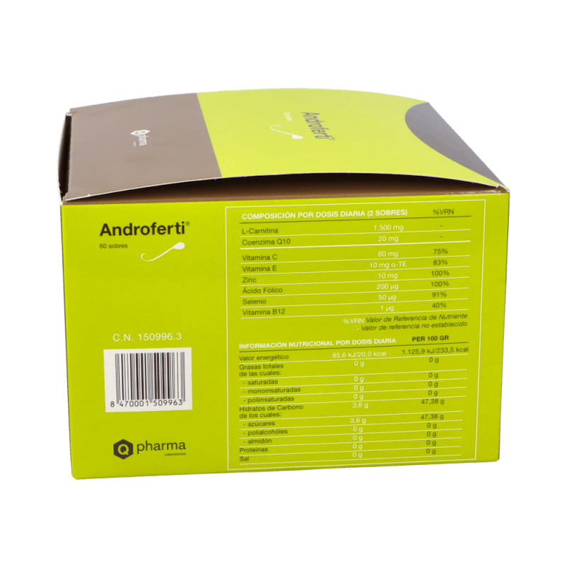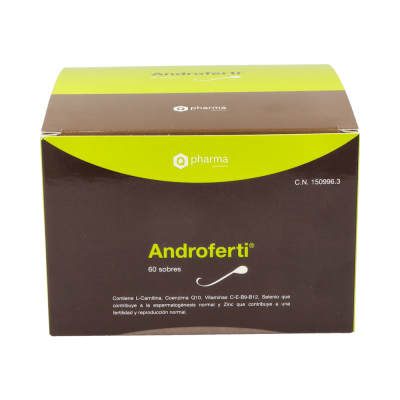 Androferti es un suplemento nutricional en formato de sobres, formulado específicamente para mejorar la calidad del esperma y la salud reproductiva masculina. Contiene una combinación equilibrada de nutrientes esenciales como la L-Carnitina, Coenzima Q10, vitaminas y minerales, que han sido seleccionados por su capacidad para promover la espermatogénesis y mejorar la fertilidad. Gracias a su composición rica en antioxidantes, vitaminas y oligoelementos, Androferti ayuda a proteger las células del estrés oxidativo y contribuye al funcionamiento normal del sistema reproductor masculino.