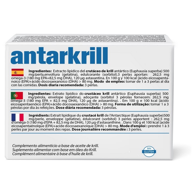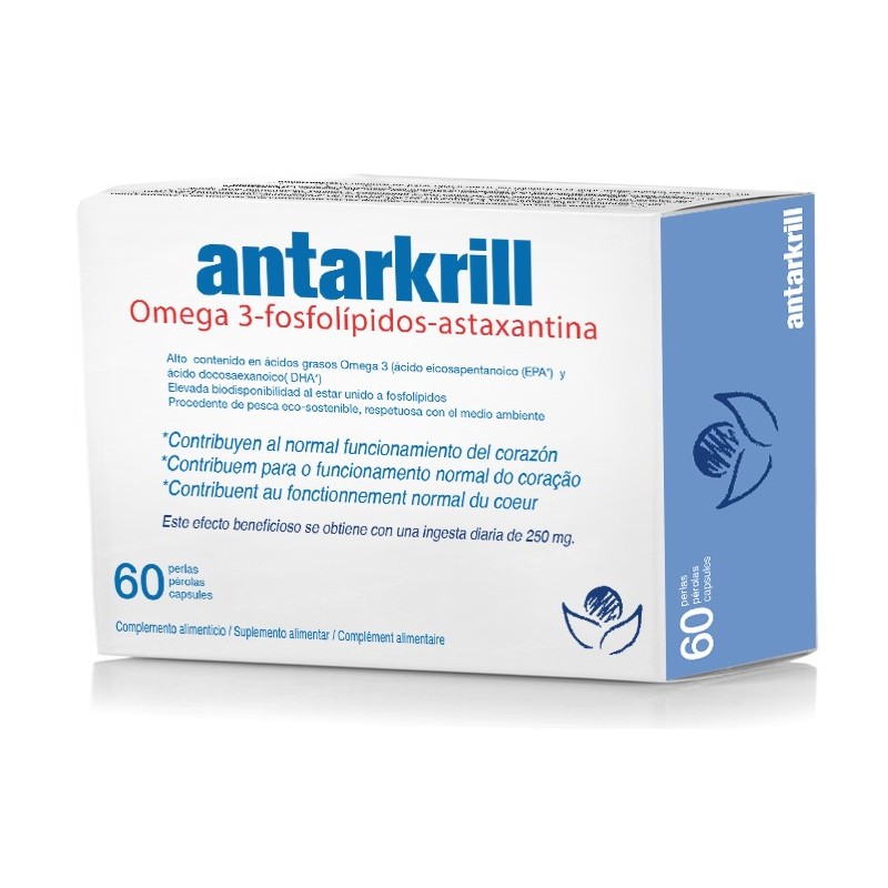 Antarkrill es un complemento alimenticio elaborado a base de aceite de krill (Euphausia superba), una fuente natural de ácidos grasos Omega-3 altamente biodisponibles. Este aceite marino destaca por su contenido en EPA (ácido eicosapentaenoico) y DHA (ácido docosahexaenoico), dos componentes esenciales que contribuyen al mantenimiento de funciones fisiológicas clave como la salud cardiovascular, la función cerebral y la visión. Además, Antarkrill incorpora de forma natural astaxantina, un potente antioxidante que protege las células frente al daño oxidativo, y fosfatidilcolina, precursora de la colina, nutriente vital para el metabolismo hepático y el desarrollo cognitivo.