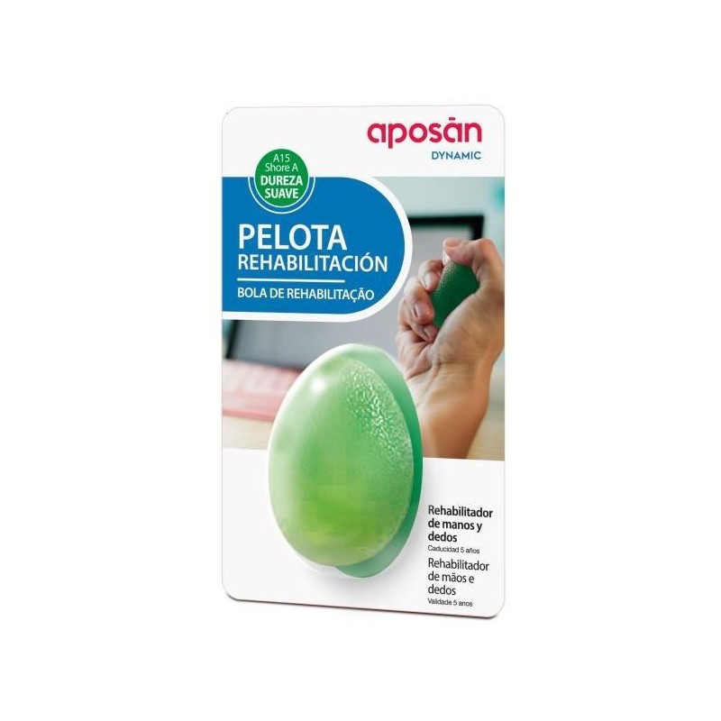 Aposan Dynamic Pelota de Rehabilitación Dureza Suave es una pelota terapéutica diseñada específicamente para ejercicios de rehabilitación y fortalecimiento muscular. Esta pelota de gel, con forma de óvalo y de color verde, pertenece a una serie de pelotas de rehabilitación que incluye también el óvalo verde y el óvalo naranja, cada una con diferentes niveles de resistencia: suave, media y alta respectivamente. La versión verde es la de menor resistencia, ideal para usuarios que buscan un inicio de menos a más en sus ejercicios terapéuticos. El gel es de una consistencia suave, indicado para llevar a cabo ejercicios con poca fuerza, especialmente tras sufrir lesiones graves o al inicio del entrenamiento.