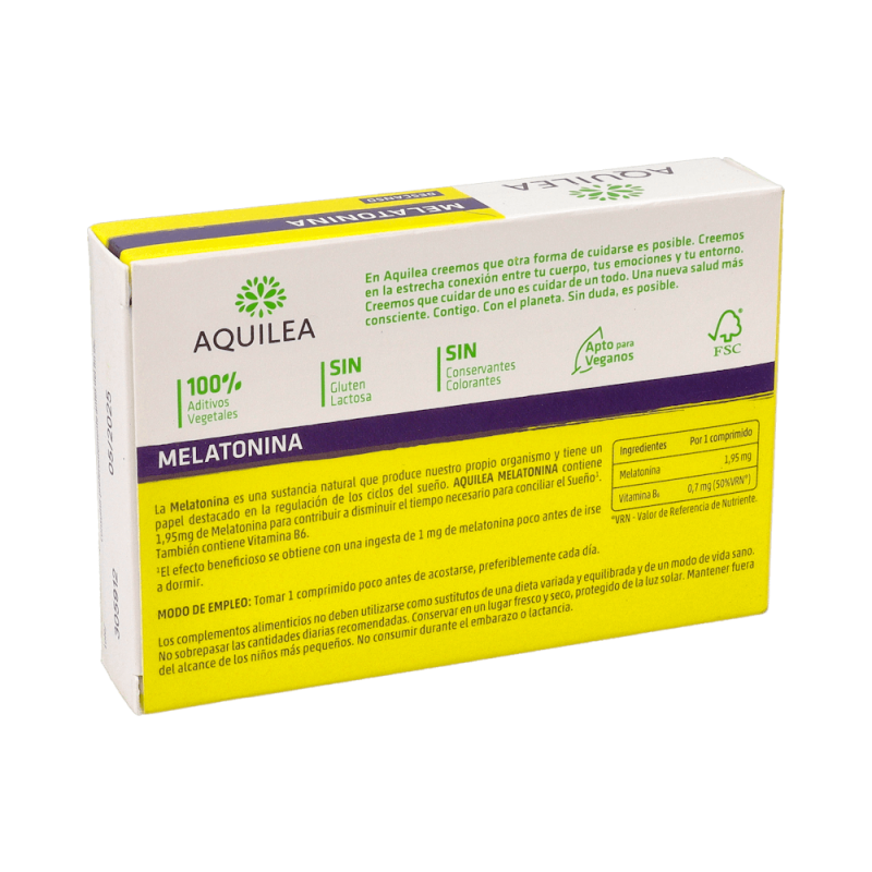 Aquilea Melatonina es un complemento alimenticio diseñado para ayudar a mejorar la calidad del sueño. Está compuesto principalmente por melatonina (1,95 mg), una hormona que el cuerpo produce de forma natural y que regula los ciclos del sueño. Además, contiene vitamina B6, que contribuye al funcionamiento normal del sistema nervioso. Este producto es ideal para personas que tienen dificultades para conciliar el sueño o para quienes experimentan trastornos relacionados con el jet lag, ya que ayuda a disminuir el tiempo necesario para conciliar el sueño y a aliviar la sensación subjetiva de desfase horario (jet lag).