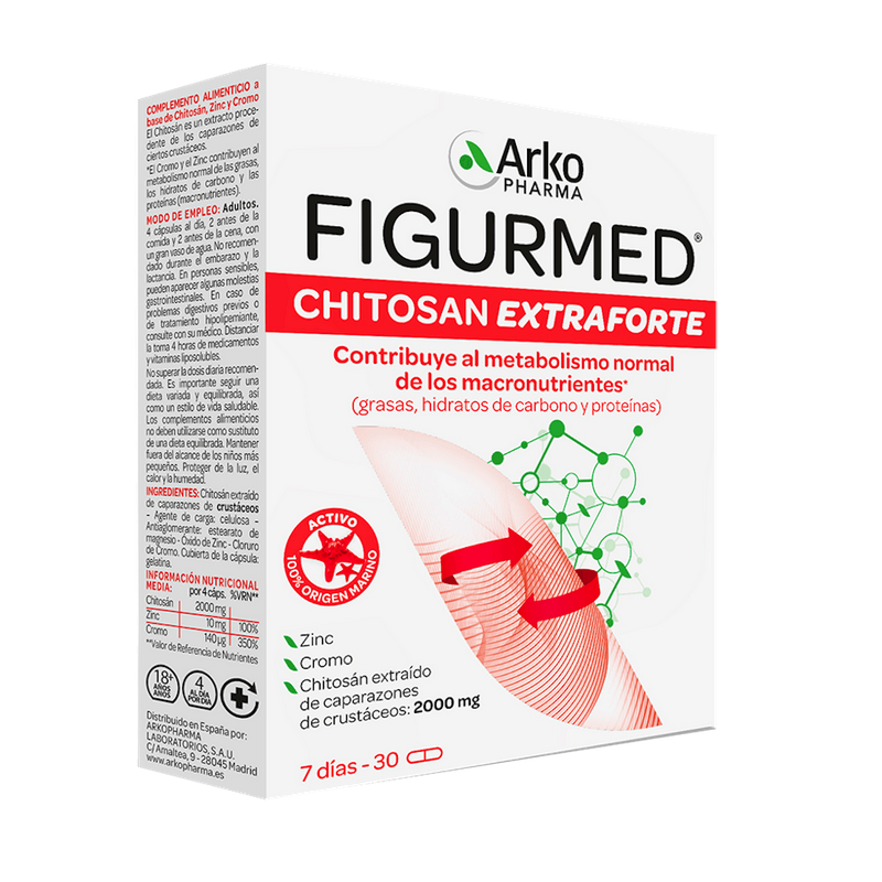 Figurmed® Chitosán Forte Cápsulas es un complemento alimenticio desarrollado a base de Chitosán y Zinc. Su fórmula está diseñada para ayudar en el manejo del peso y en el metabolismo de los macronutrientes, como las grasas, proteínas e hidratos de carbono. El Chitosán es un polisacárido natural derivado de los caparazones de ciertos crustáceos, conocido por su capacidad para captar grasas en el sistema digestivo. Por su parte, el Zinc es un mineral esencial que contribuye al funcionamiento normal del metabolismo.