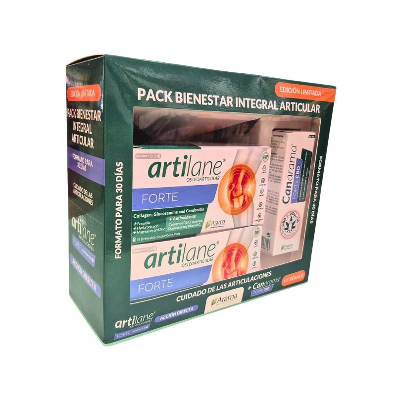El Pack Artilane Duplo + Canarama Crema combina dos soluciones complementarias desarrolladas por Arama Natural España para cuidar tus articulaciones y aliviar las molestias musculares o articulares. Este exclusivo pack une la eficacia del complemento alimenticio Artilane® Forte, que ayuda a mantener las articulaciones fuertes y flexibles, con la acción calmante y reconfortante del gel tópico Canarama® Forte CBD, formulado para aliviar la sensación de dolor localizada y favorecer la recuperación muscular.