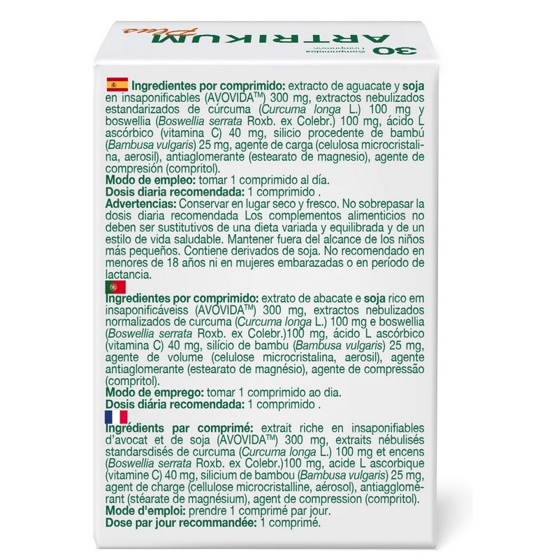 Artrikum Plus es un complemento alimenticio formulado con ingredientes activos de origen vegetal como AVOVIDA™ (extracto de aguacate y soja), boswellia, cúrcuma y vitamina C.