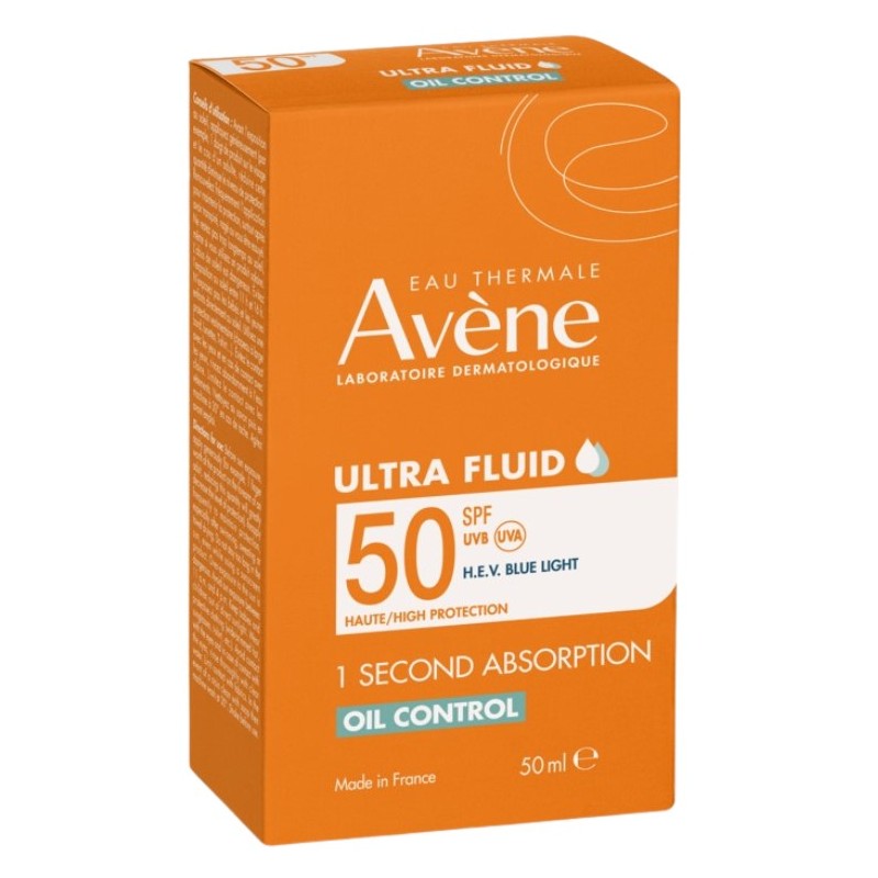 Avene Ultra Fluido Oil Control SPF 50 es un protector solar facial de ultraamplio espectro que protege contra los rayos UVB, UVA y la Luz Azul (HEV) hasta 450 nm. Su textura ultraligera y de absorción inmediata garantiza un acabado invisible en solo un segundo.