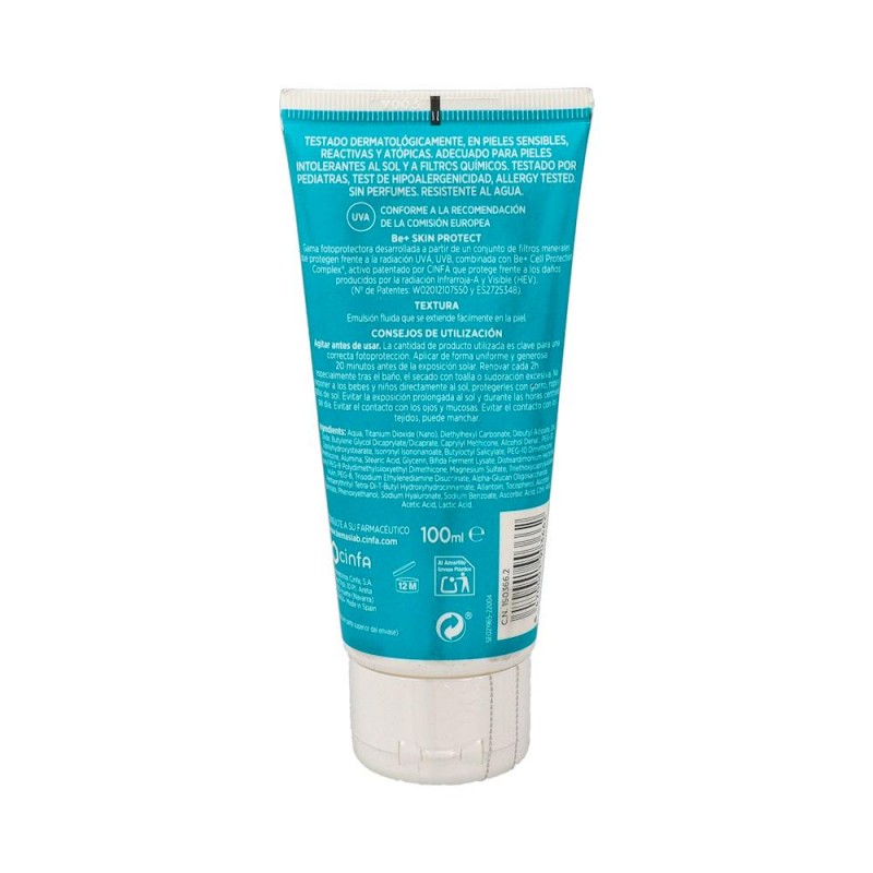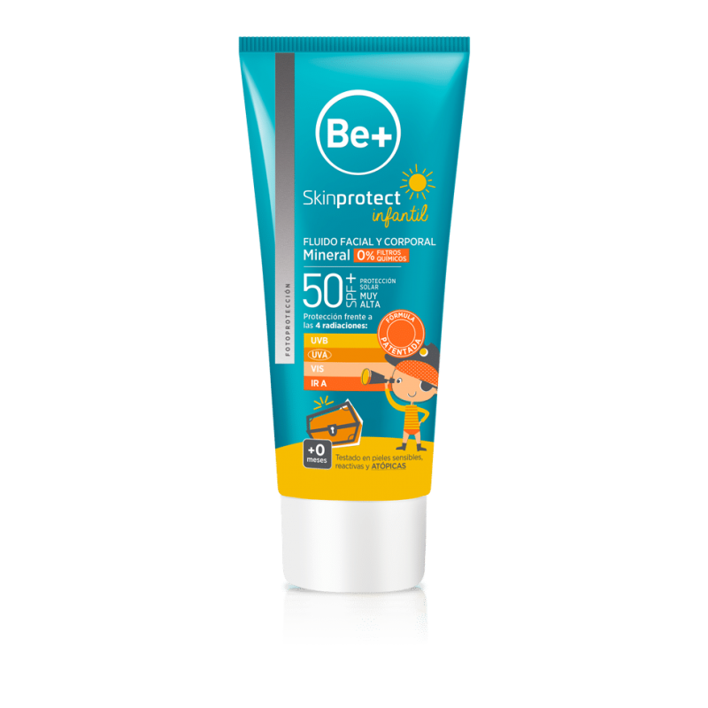 Be+ Skinprotect Infantil Fluido Facial y Corporal SPF50+ es un protector solar mineral para bebés, sin filtros químicos, resistente al agua y sin perfume. Indicado para pieles sensibles, reactivas y atópicas, protege frente a UVA, UVB, IR-A y luz visible con alta tolerancia pediátrica.