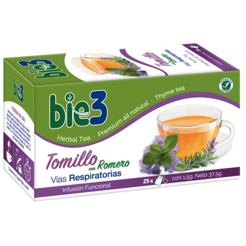 Bie3 Tomillo con Romero está indicado para personas que deseen cuidar su sistema respiratorio de forma natural, especialmente durante episodios de resfriados, gripes, faringitis, bronquitis, amigdalitis o en casos de tos seca o productiva. Sus ingredientes actúan como expectorantes, mucolíticos y antiespasmódicos, ayudando a calmar la garganta y aliviar la congestión. Además, el tomillo posee un reconocido efecto antimicrobiano gracias al timol, mientras que el romero aporta compuestos antioxidantes y antiinflamatorios que refuerzan la protección natural del organismo. Esta infusión también es útil para quienes buscan mejorar la digestión tras comidas pesadas, gracias al efecto carminativo del tomillo.