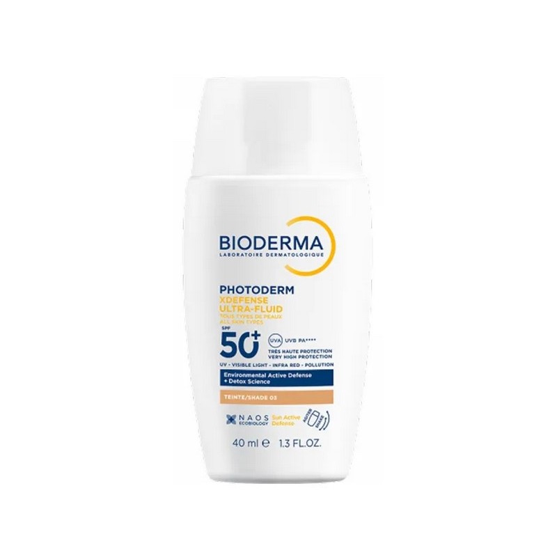 Bioderma Photoderm XDefense Ultra-Fluid SPF50+ Tono 03 es un protector solar facial diario con color que ofrece protección muy alta SPF50+ frente a rayos UV, luz visible, infrarroja y contaminación. Con acción detox, acabado natural y textura ultra fluida, hidrata durante 8 horas y actúa como base de maquillaje para una piel protegida, uniforme y luminosa.