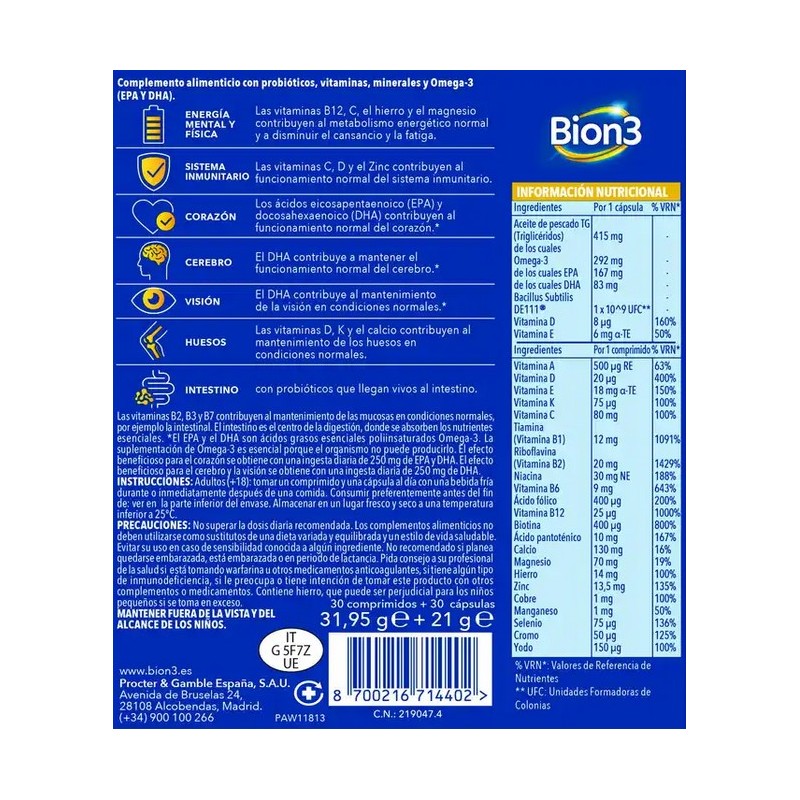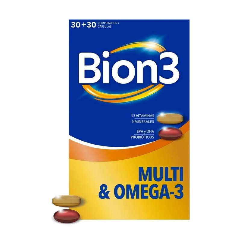 Bion3 Multi & Omega-3 con Probióticos es un complemento alimenticio completo para adultos que combina multivitaminas, minerales, Omega-3 (EPA y DHA) y probióticos. Ayuda a mantener la energía física y mental, apoya el corazón, el cerebro, la visión y el equilibrio intestinal, con una cómoda dosis diaria de 1 comprimido y 1 cápsula.