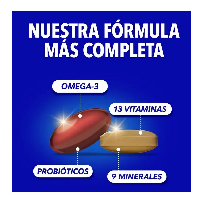 Gracias a su combinación de 13 vitaminas y 9 minerales, junto con EPA y DHA (Omega-3) y probióticos que llegan vivos al intestino, este complemento ayuda a cubrir necesidades nutricionales clave relacionadas con el metabolismo energético, el sistema inmunitario y la salud digestiva.