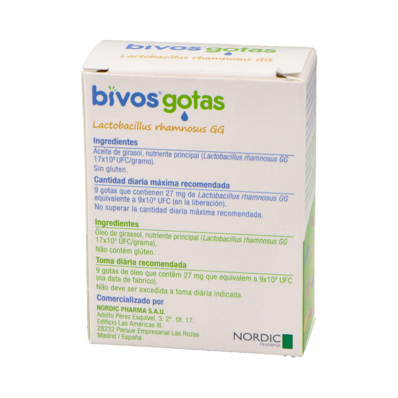 Bivos Gotas Lactobacillus GG está indicado para prevenir y tratar desequilibrios en la flora intestinal. Este producto es ideal para personas que han pasado por un tratamiento con antibióticos, ya que estos medicamentos pueden alterar la microbiota intestinal. También es efectivo en el tratamiento de la diarrea aguda causada por infecciones virales, como el rotavirus, o por intoxicaciones alimentarias. Gracias a su acción probiótica, contribuye a restaurar el equilibrio de la flora intestinal, ayudando a mejorar la digestión y el sistema inmunológico.