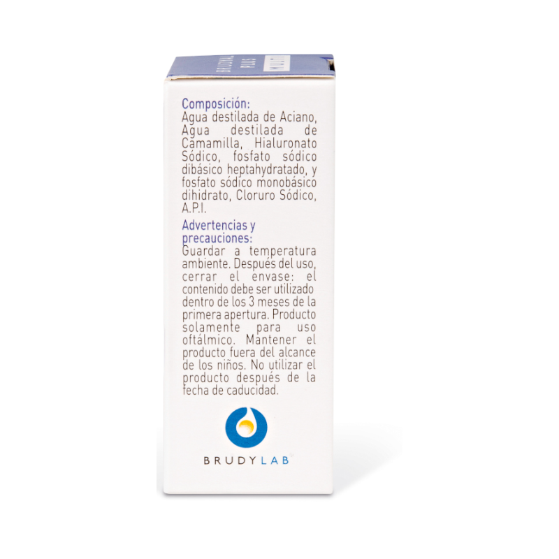 La fórmula de Brudyal Plus Multi Colirio combina hialuronato sódico, agua destilada de aciano azul y manzanilla, junto con tampones fosfato y cloruro sódico, ofreciendo una acción calmante, hidratante y protectora de la superficie ocular frente a los daños provocados por agentes externos y radicales libres.