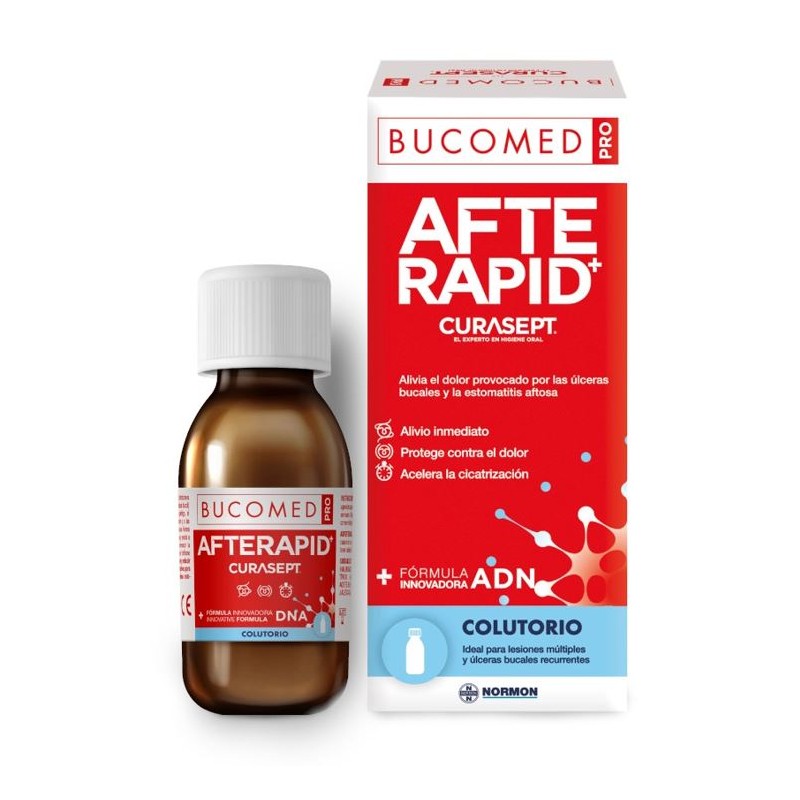 BUCOMED PRO Afterapid Curasept Colutorio es un producto sanitario bucal con una fórmula pionera de triple acción diseñada especialmente para el tratamiento de las aftas, úlceras orales y otras lesiones dolorosas de la cavidad bucal.