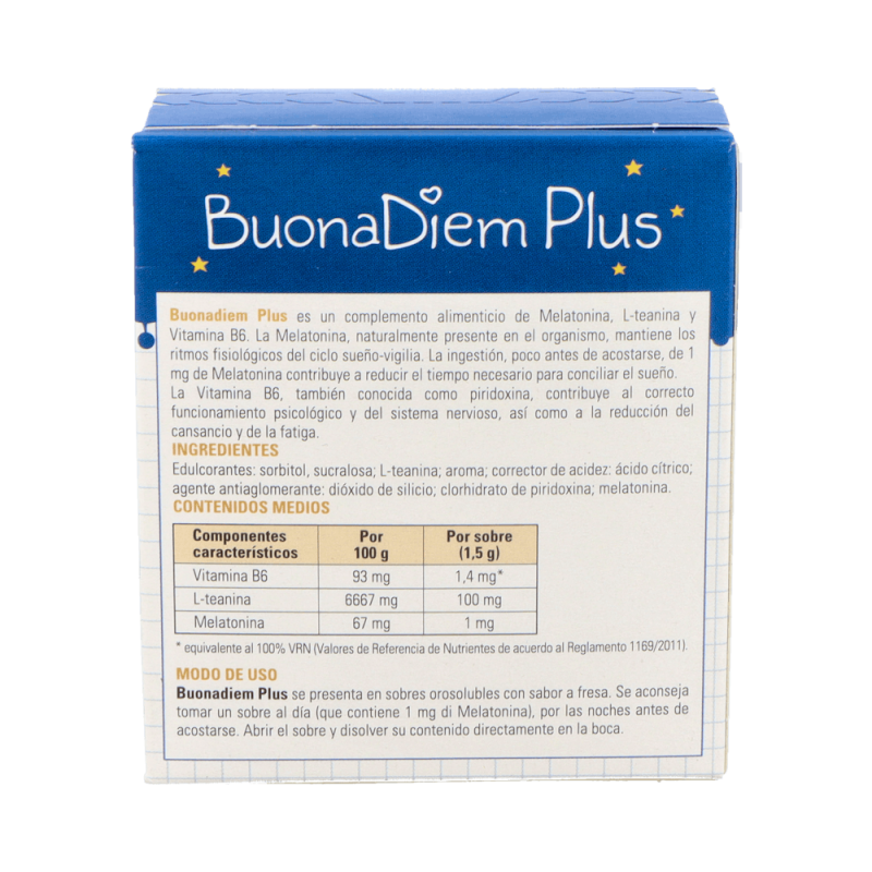 Buona Buonadiem Plus es el complemento perfecto para quienes necesitan mejorar su calidad de sueño y reducir los efectos del estrés diario. Su combinación de Melatonina, L-teanina y Vitamina B6 lo convierte en una solución natural y efectiva para promover el descanso, relajar la mente y recuperar energía. Gracias a su práctico formato en sobres, es fácil de consumir y adecuado para personas con un ritmo de vida acelerado.