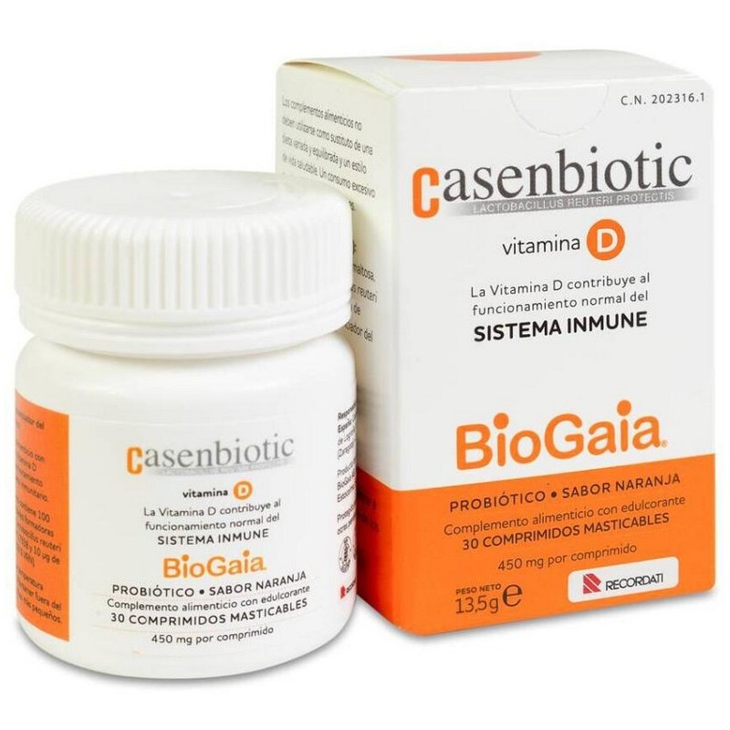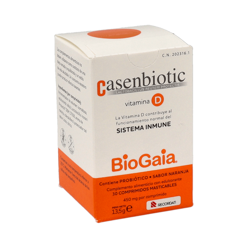 Casenbiotic Vitamina D es un suplemento alimenticio formulado a base de Lactobacillus Reuteri y vitamina D, diseñado para favorecer la salud digestiva y fortalecer el sistema inmunológico. Este producto viene en presentación de comprimidos masticables con fermentos lácteos vivos, que ayudan a mantener un correcto equilibrio de las bacterias beneficiosas en el sistema digestivo, desde el estómago hasta el intestino. Además, su contenido en vitamina D es fundamental para la salud ósea y para procesos de división celular.