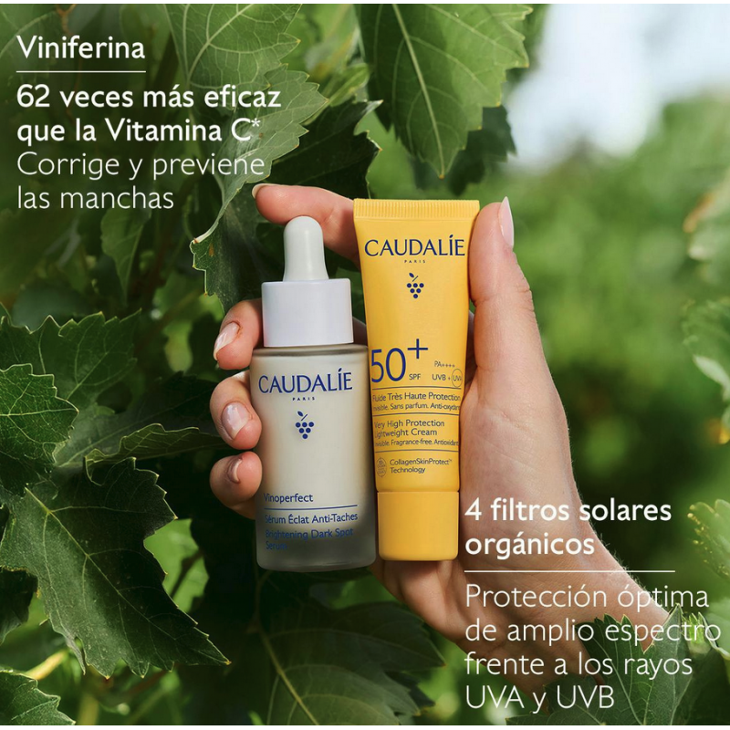 Caudalie Vinoperfect Dúo Antimanchas del verano combina un potente sérum antimanchas con un protector solar SPF50+ para reducir manchas, prevenir su aparición y unificar el tono. Ideal para lograr una piel luminosa, protegida y sin hiperpigmentación durante el verano.