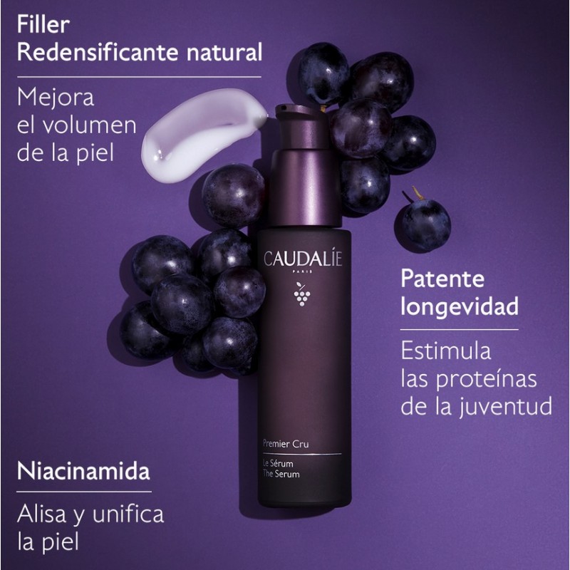 Caudalie Premier Cru El Sérum con Patente Longevidad es un sérum antiedad global para todo tipo de pieles que proporciona hidratación intensa, efecto tensor inmediato y mejora visible de la firmeza y luminosidad. Formulado con la Patente Longevidad Caudalie x Harvard, viniferina y niacinamidas, ayuda a rejuvenecer la piel día tras día.