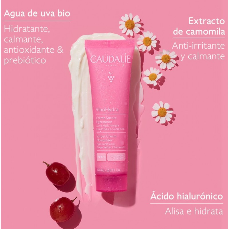 Caudalíe VinoHydra Crema Sorbete Ácido Hialurónico + Camomila hidrata y calma las pieles normales y sensibles con una textura gel-crema ultraligera. Reduce rojeces, refuerza la barrera cutánea y aporta frescor inmediato gracias al ácido hialurónico, la camomila y el agua de uva bio.