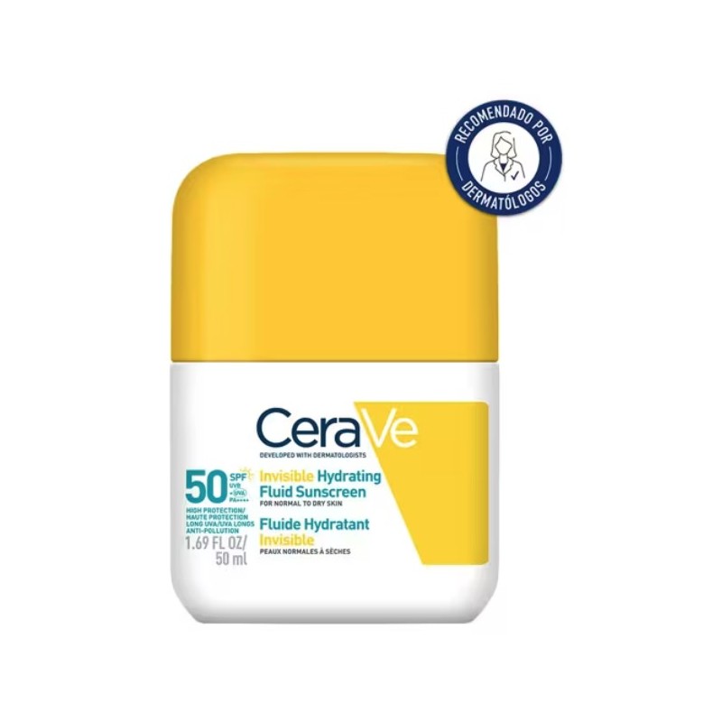 CeraVe Protector Solar Fluido Invisible Hidratante SPF 50+ es un protector solar facial SPF 50+ de amplio espectro que protege frente a los rayos UVA y UVB mientras hidrata durante 24 horas gracias a sus 3 ceramidas esenciales y tecnología MVE. Su textura ligera e invisible es ideal para uso diario y perfecta como base de maquillaje. Apto para todo tipo de pieles y no comedogénico.
