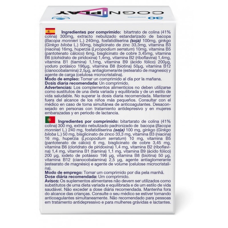 Cogniplay es un complemento alimenticio formulado con una combinación sinérgica de extractos vegetales, colina, fosfatidilserina, vitaminas del grupo B y minerales, diseñado para estimular el rendimiento cognitivo, reforzar la memoria y mejorar la concentración.