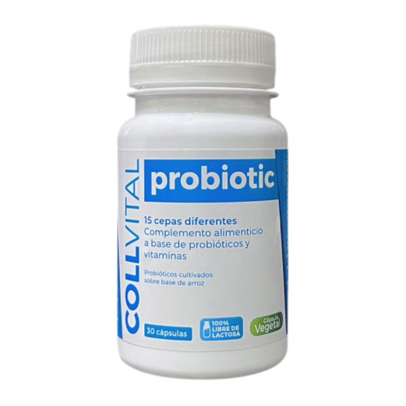 COLLVITAL Probiotic es un complemento alimenticio premium formulado con una exclusiva combinación de 15 cepas probióticas (8 de Lactobacillus, 5 de Bifidobacterium, 1 de Enterococcus y 1 de Streptococcus), enriquecidas con Vitaminas C y D para un efecto sinérgico sobre la salud digestiva e inmunitaria. Gracias a su alta diversidad de microorganismos beneficiosos, este suplemento favorece el equilibrio óptimo de la microbiota intestinal, inhibe el crecimiento de bacterias patógenas y promueve una digestión saludable. Su fórmula está especialmente diseñada para reforzar el sistema inmunológico, estimular la producción de Inmunoglobulina A (IgA) y mejorar el bienestar gastrointestinal de forma natural y segura.