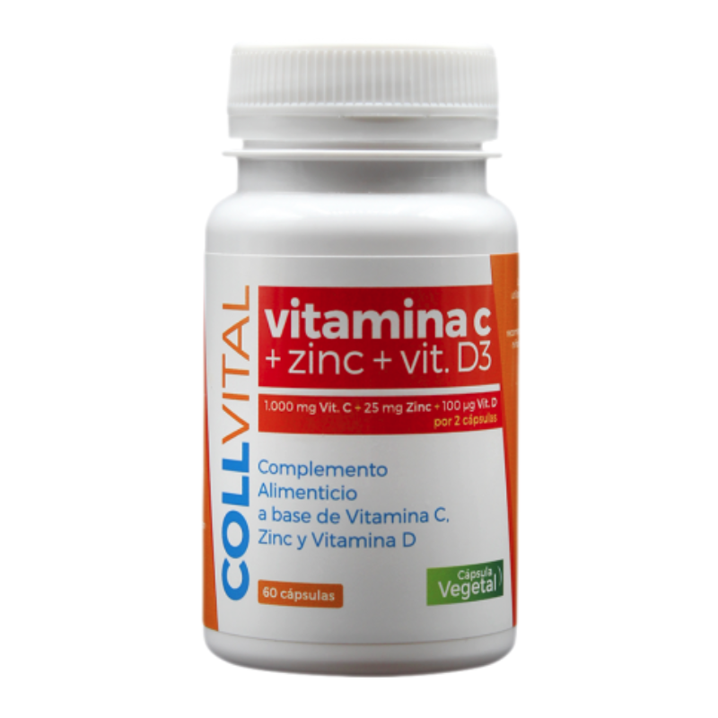 COLLVITAL Vitamina C+D+Zinc es un complemento alimenticio de alta eficacia formulado para fortalecer las defensas naturales del organismo y aportar energía para tu día a día. Su fórmula combina tres potentes aliados para la salud: vitamina C, vitamina D y zinc, ingredientes esenciales para mantener el correcto funcionamiento del sistema inmunitario, favorecer la regeneración celular y proteger frente al daño oxidativo.