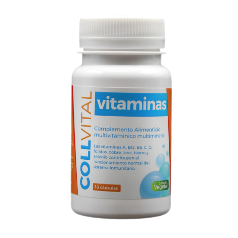 COLLVITAL Vitaminas es un complemento alimenticio formulado con una combinación completa de 12 vitaminas y 8 minerales esenciales que contribuyen al funcionamiento óptimo del organismo. Este potente complejo multivitamínico y multimineral está diseñado para aportar la energía que necesitas en tu día a día, ayudando a mantener tu vitalidad y bienestar general.