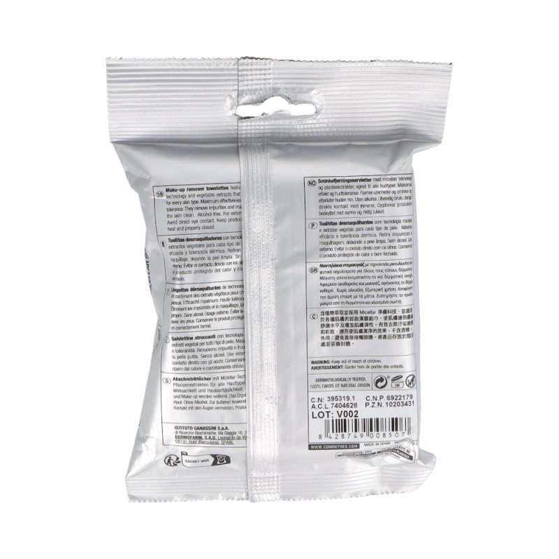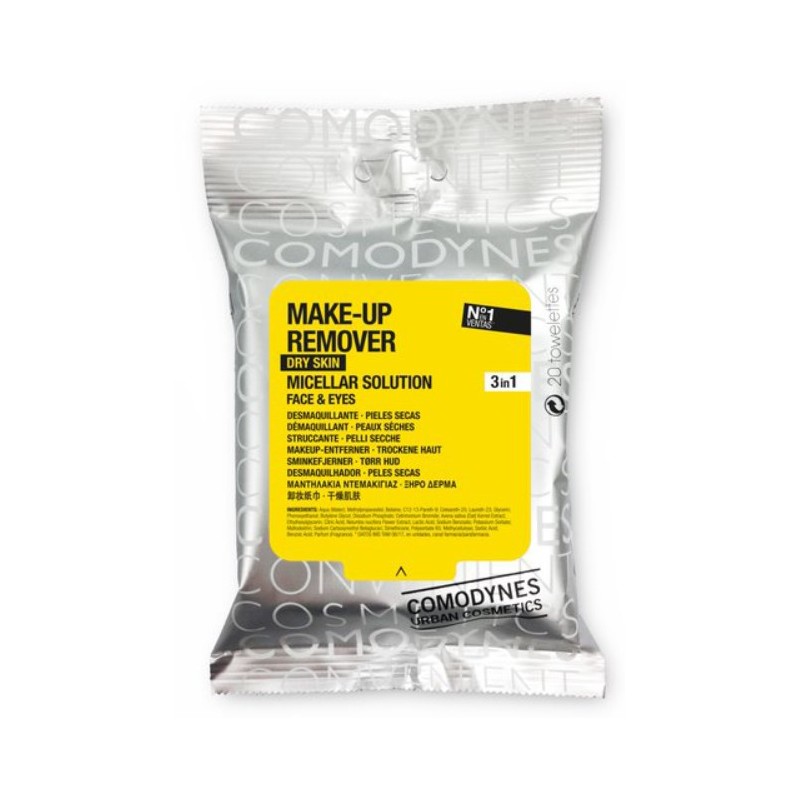 Comodynes Toallitas Desmaquillantes Piel Seca son toallitas limpiadoras extrasuaves formuladas con agua micelar y extractos naturales que eliminan impurezas y maquillaje mientras aportan hidratación y frescor a la piel. Diseñadas para pieles sensibles, su efecto 3 en 1 sustituye la leche limpiadora, el tónico facial y el desmaquillante de ojos.