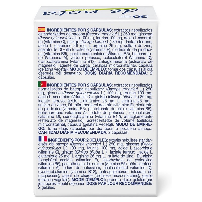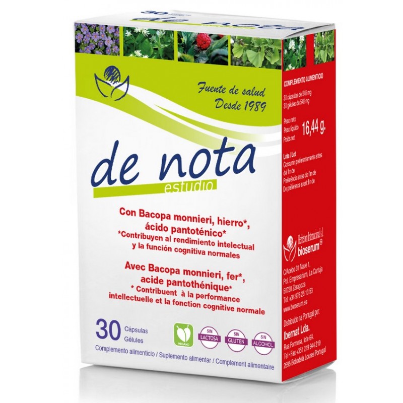 De Nota es un complemento alimenticio formulado a base de extractos vegetales estandarizados, aminoácidos esenciales, vitaminas y minerales que ayudan a mantener el rendimiento cognitivo, la memoria y la concentración en momentos de alta exigencia mental. Gracias a su combinación de ingredientes naturales como ginkgo biloba, bacopa monnieri y ginseng americano, junto con nutrientes clave como el hierro, el zinc y el yodo, De Nota se convierte en un aliado eficaz para estudiantes, profesionales y cualquier persona que desee mejorar su agilidad mental y resistencia al estrés cognitivo.