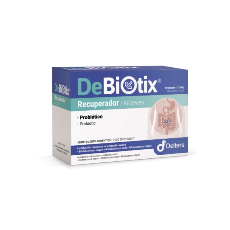 DeBiOtix Recuperador es un complemento alimenticio probiótico que ayuda a equilibrar la flora intestinal y mejorar el bienestar digestivo. Ideal tras antibióticos o molestias gastrointestinales. Toma un sobre al día para recuperar tu confort digestivo con eficacia.