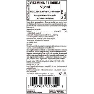 Solgar® Vitamina E Líquida de Fuente natural - 59,2 ml, se presenta en una formulación líquida para favorecer la absorción de este nutriente liposoluble. La vitamina E contribuye a proteger las células del estrés...