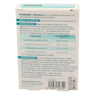 Probiobal ATB Direct es un probiótico de 17.000 millones de UFC con Lactobacillus acidophilus NCFM, Lacticaseibacillus paracasei Lpc-37 y Bifidobacterium lactis, indicado para el equilibrio de la flora intestinal...