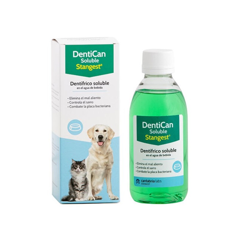 Dentican Soluble Stangest es una innovadora solución para la higiene buco-dental de las mascotas, diseñada para facilitar el cuidado diario de la salud oral de los perros. Su formato soluble permite que el producto se disuelva directamente en el agua de bebida, ofreciendo una alternativa práctica y eficaz al cepillado tradicional.