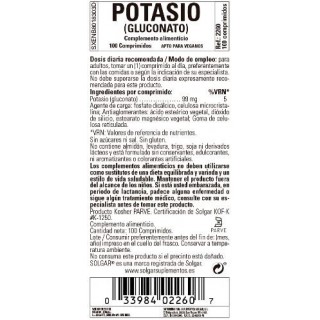 Solgar Potasio Gluconato es un suplemento alimenticio que proporciona una fuente de potasio en forma de sal orgánica de gluconato, una forma que mejora su biodisponibilidad en el organismo.