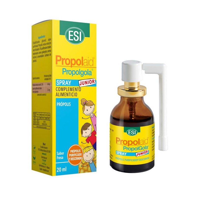 ESI Propolaid Propolgola Junior Própolis Spray es un spray formulado a base de extracto de própolis altamente purificado, ideal para aliviar y tratar el dolor de garganta en niños a partir de los 3 años.