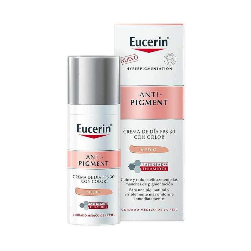 Eucerin Anti-Pigment Día FPS 30 Con Color combina Thiamidol® y pigmentos minerales para reducir las manchas oscuras y unificar el tono de la piel al instante. Con protección solar FPS 30 y defensa frente a rayos UVA y luz azul, hidrata, protege y aporta un acabado natural y luminoso. Ideal como base de maquillaje diaria.