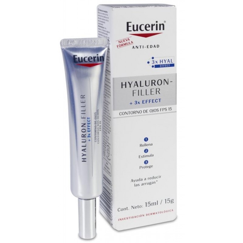 La fórmula de Eucerin Hyaluron-Filler Contorno de Ojos FPS 15 combina tres potentes activos antiedad: